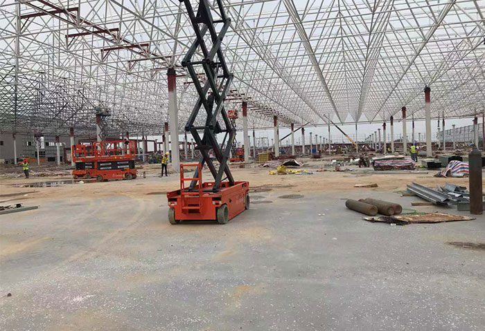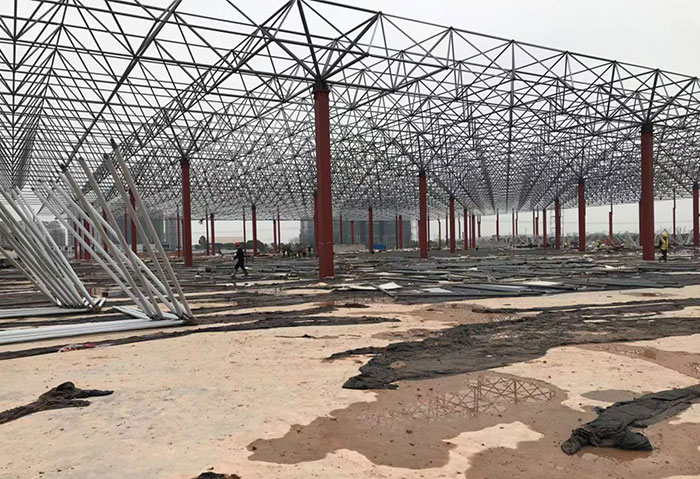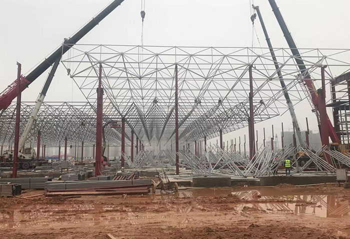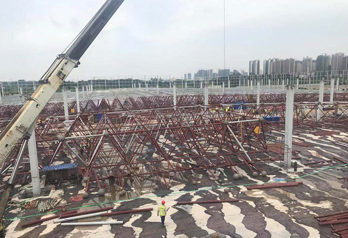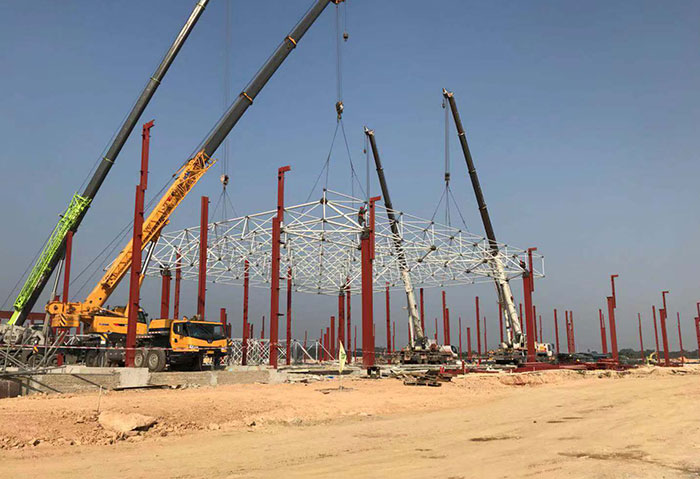 Guangdong zhaoqing xiaopeng new energy automobile grid stamping workshop covers an area of 20566 square meters. This project has a large span and a large load, and adopts the construction method of bolt ball and welding for mutual matching type grid structure. It adopts the method of block hoisting, air butt lifting (" plus similar "to" huiteng grid structure "adds luster to the national new energy project).